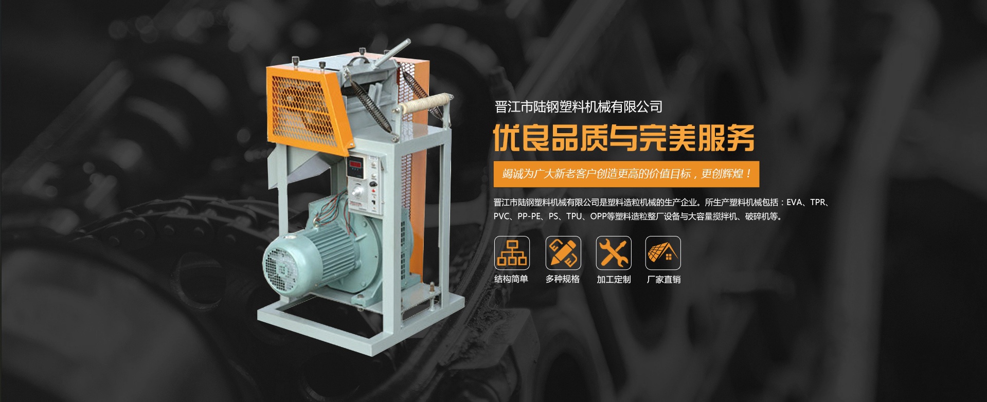 晉江市陸鋼塑料機(jī)械有限公司是塑料造粒機(jī)械的生產(chǎn)企業(yè)。所生產(chǎn)塑料機(jī)械包括:EVA、TPR、PVC、PP-PE、PS、TPU、OPP等塑料造粒整廠設(shè)備與大容量攪拌機(jī)、破碎機(jī)等。